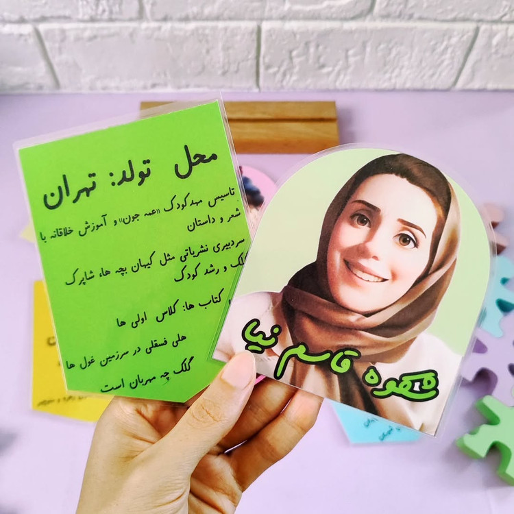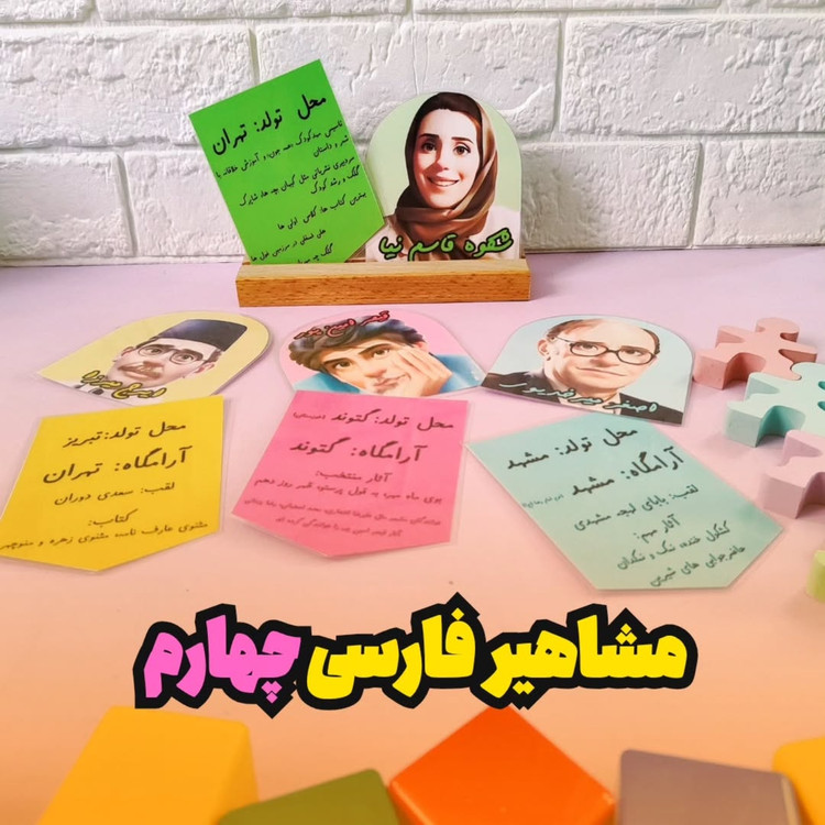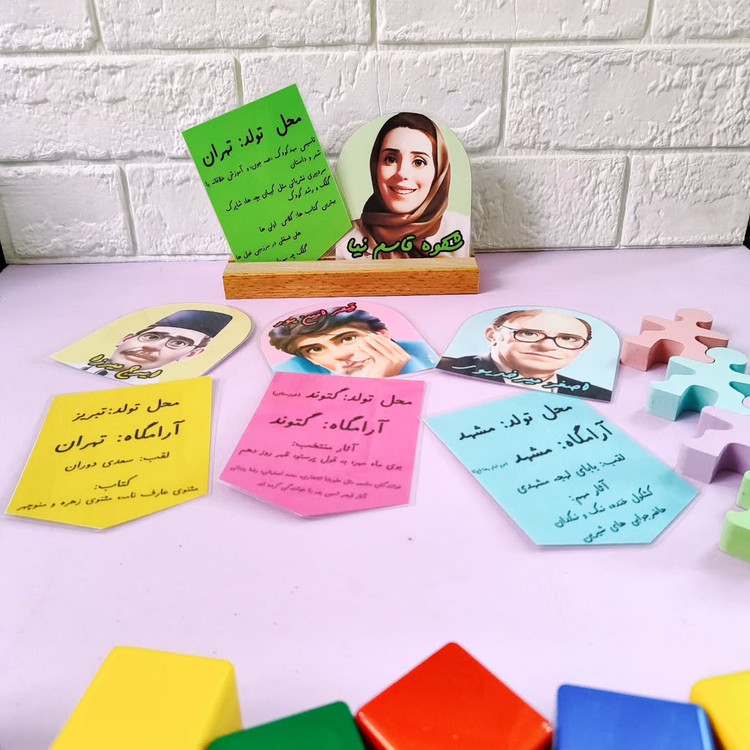 این ابزار به آشنایی و به خاطر سپاری از مشاهیر دوست داشتنی کشورمون که آثارشان رو توی کتاب فارسی چهارم میبینیم کمک میکنه شامل ۲۸ تا کارت هست سایز هر کارت ۱۰×۱۵ هست جنسشون هم که لمینتیه