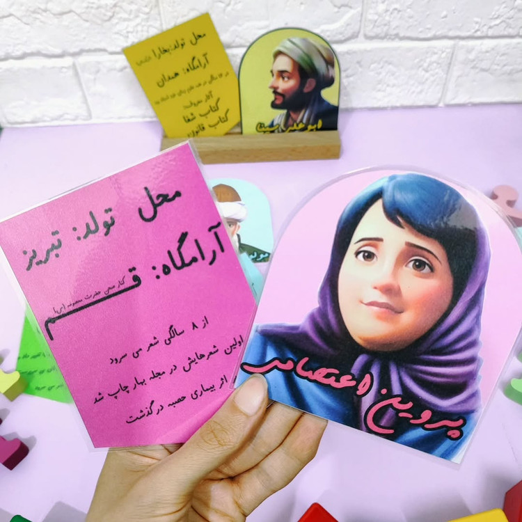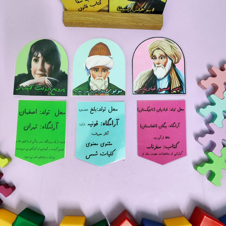 این ابزار ویژه پایه پنجم هست مشاهیر کتاب فارسی به همراه تصویر و خلاصه ای از اطلاعاتشون در دو کارت جداگانه طراحی شده از رنگ های جذاب و زنده استفاده کردیم و سعی کردیم اطلاعات هر شخصیت کوتاه و مختصر و مفید باشه. دیوار کلاستون رو رنگارنگ میکنه و در کنارش کاری نو و بدیع هست جمعا ۲۴ کارت هست اندازه هر کارت حدودا ۱۰×۱۵ سانته با جنس لمینتی